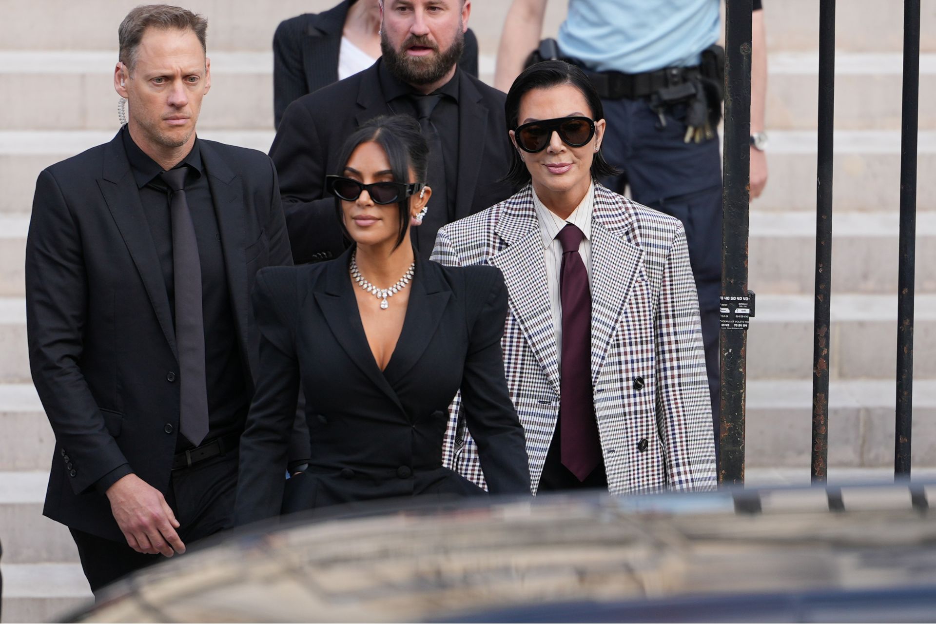 PARIS, FRANCE – MAY 13: Kim Kardashian and Kris Jenner exit the trial at the Palais de Justice ; Kim Kardashian wears sunglasses by Alaia, a black dress with power shoulders / shoulder pads / puff shoulders and low-neck by John Galliano, a necklace by Samer Halimeh, Repossi diamond earcuffs, Brioni Raymond earrings, at the Palais de Justice, on May 13, 2025 in Paris, France. (Photo by Edward Berthelot/GC Images)