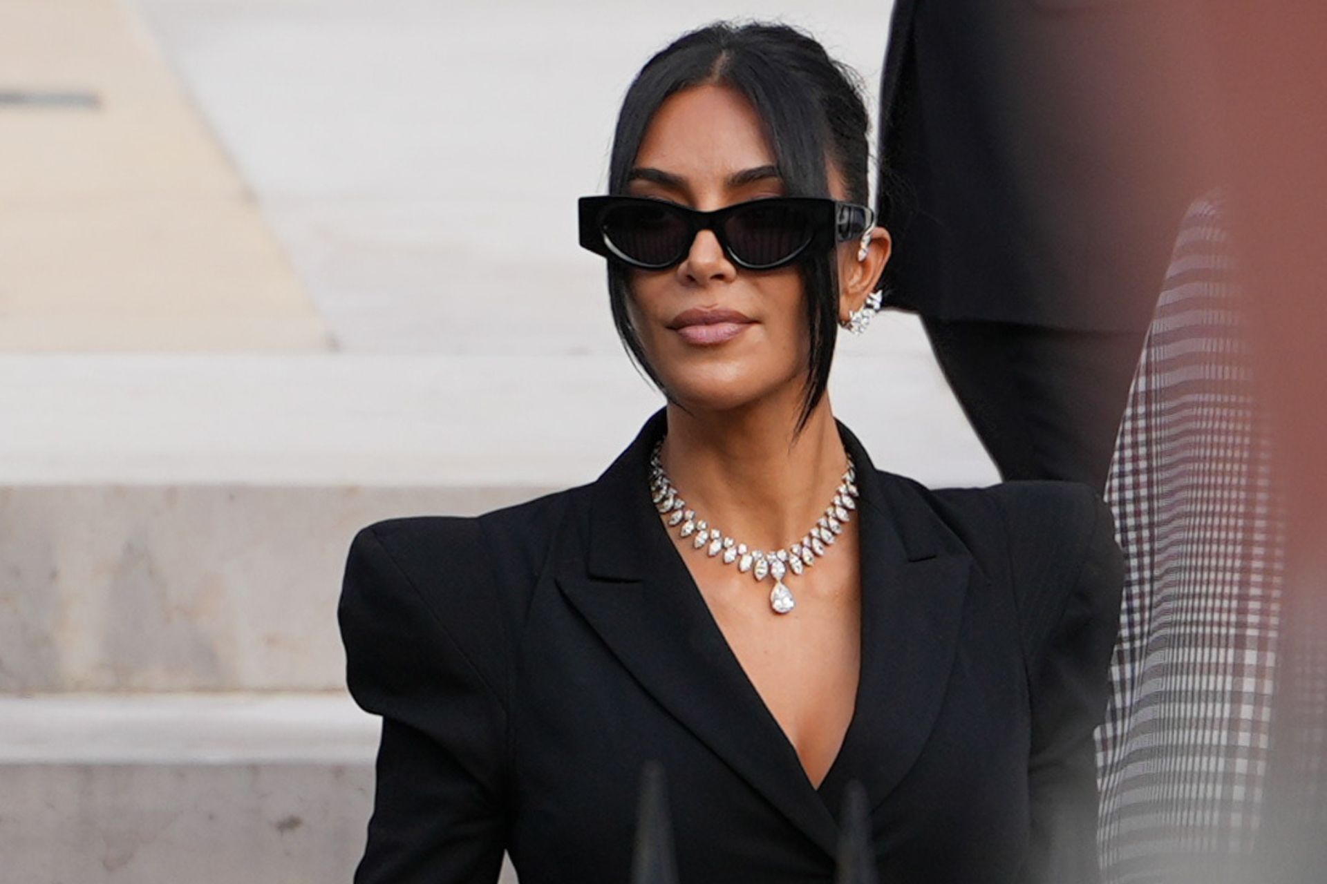PARIS, FRANCE – MAY 13: Kim Kardashian exits the trial at the Palais de Justice, and wears sunglasses by Alaia, a black dress designed as a double breasted gathered blazer jacket with power shoulders / shoulder pads / puff shoulders and low-neck by John Galliano, a necklace by Samer Halimeh, Repossi diamond earcuffs, Brioni Raymond earrings, at the Palais de Justice, on May 13, 2025 in Paris, France. (Photo by Edward Berthelot/GC Images)